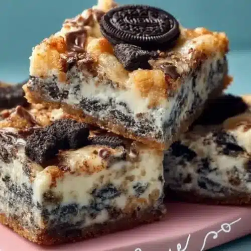 Serve these bars slightly chilled so the layers hold their shape; they look best with the top cookies visible and a few chocolate pockets showing. A small dusting of extra cookie crumbs on the plate or a single broken cookie piece on each bar makes them feel intentionally finished rather than rushed. They’re great cut into small squares for a party tray or into larger bars for dessert alongside coffee.