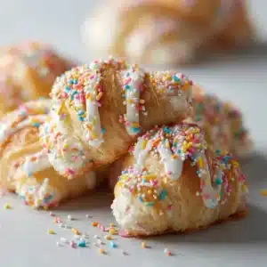 If you want a dessert that looks festive with almost no effort, these funfetti-stuffed crescents are it—golden pastry outside, creamy vanilla-speckled center inside, and that quick glaze that makes them feel finished.