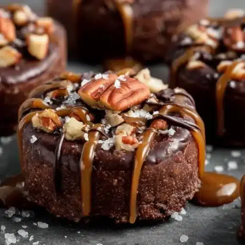 Serve these straight from the fridge for the cleanest layers—the caramel stays tucked in the center, and the chocolate drizzle has that little “snap.” If you’re putting them on a platter, a tiny pinch of flaky salt on a few of them helps guests instantly understand the turtle vibe. They’re also a great addition to a bite-sized dessert spread alongside something baked like Cadbury brownie bites for contrast.