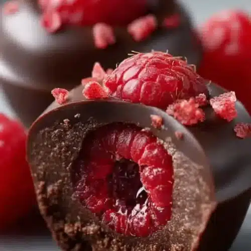 I pull these out of the fridge and something about the snap of dark chocolate against the soft, jammy center always feels a little celebratory. They’re small — no fork required — but the contrast between glossy, bittersweet shells and the bright raspberry filling makes each bite feel precisely composed.