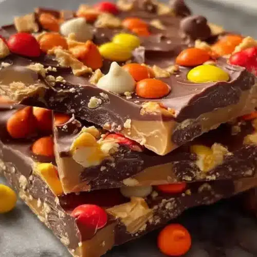 I put this bark together when I wanted something “party-cute” but not fussy—more like a candy-shop slab than a baked dessert. Reese’s Pieces do most of the decorating work for you, and the white chocolate plus peanut butter layer gives you that creamy top that sets firm enough to slice but still feels rich when you bite in.