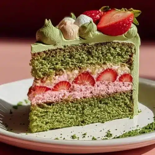 There’s something impossibly fresh about the combination of green matcha and bright strawberry — it cuts through heavy sweetness and keeps each slice feeling light and lively. This cake bakes up tender and moist, a soft pale-green crumb threaded with grassy matcha and finished with a tangy, pink strawberry cream that isn’t cloying. If you like the idea of a matcha latte in cake form, this is the one to make right now.