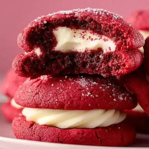 I keep the dough straightforward—butter, sugars, cocoa, and a touch of red food coloring—so the highlighted flavor is that tangy cream cheese filling. If you like variations on cream cheese-filled red velvet treats, you can compare textures with other recipes like red velvet cheesecake cookies for inspiration.